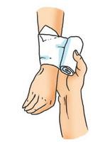 30、普通头部包扎是将三角巾罩于面部,剪孔处正好露出眼、鼻,三角巾左右两角拉到颈后在前面打结。